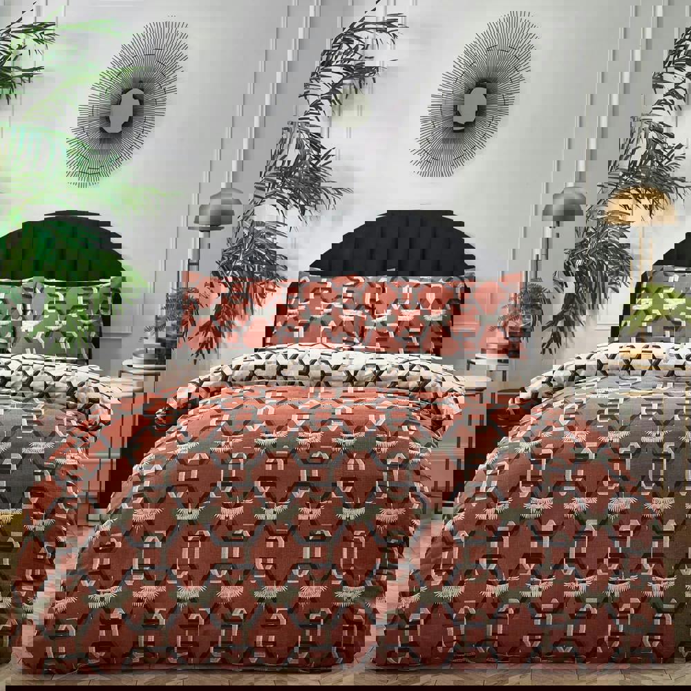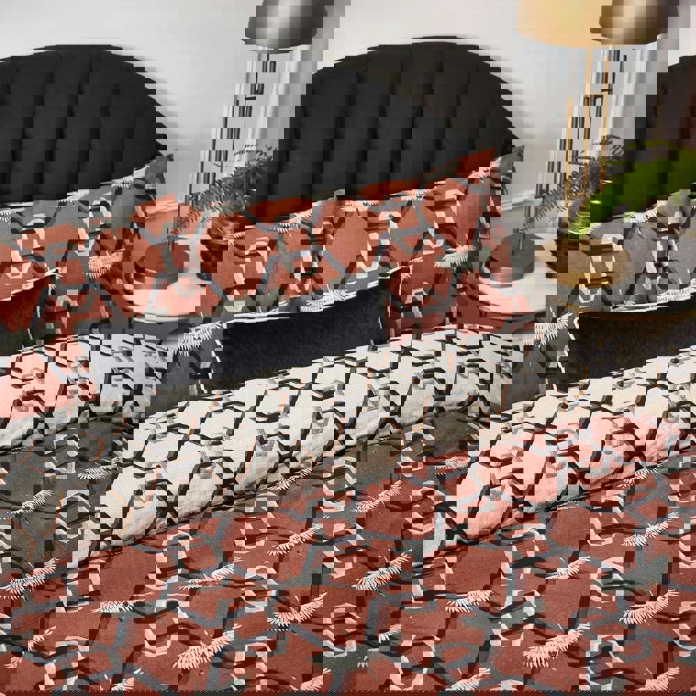 The Furn Avalon Geometric Duvet Cover Set in Brick brings a bold, graphic look to your bedroom with a printed design featuring geometric hexagon shapes, contrast detailing and a crane motif. Reversible for a quick refresh, it lets you switch up the look of your bed without changing your routine.