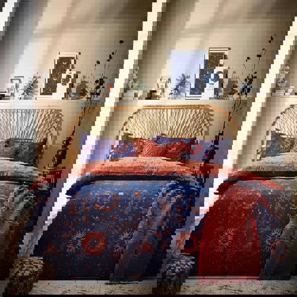 The Furn Constellation Duvet Cover Set in bronze and navy brings a celestial look to your bedroom, featuring a reversible design with moon, sun and star motifs. Designed for everyday use, it offers a soft-touch feel and an easy-care finish to help keep your bedding routine simple.