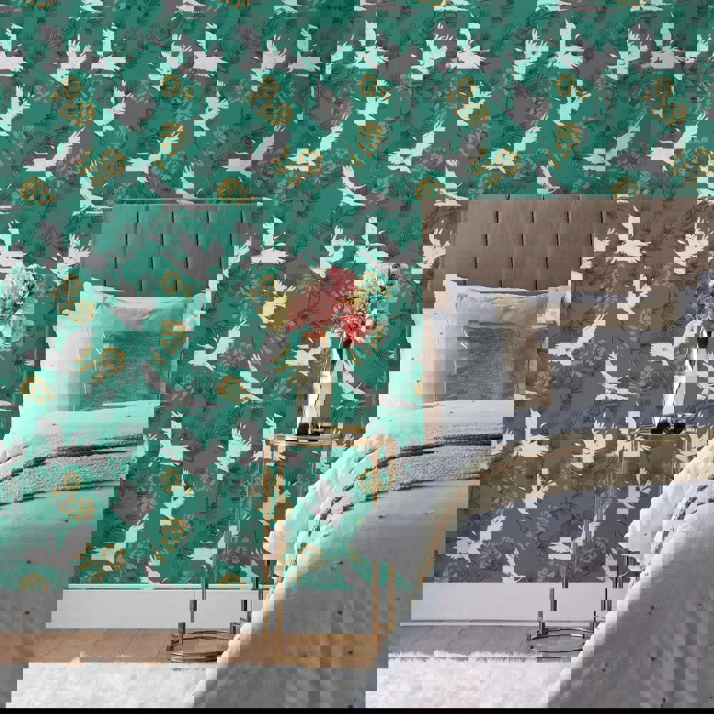 Furn Demoiselle Wallpaper - Jade is a decorative Wallpaper designed to bring pattern and colour to your interior. The design features cranes with a tropical theme, creating a distinctive look that can be used to refresh a single feature wall or coordinate across a room.