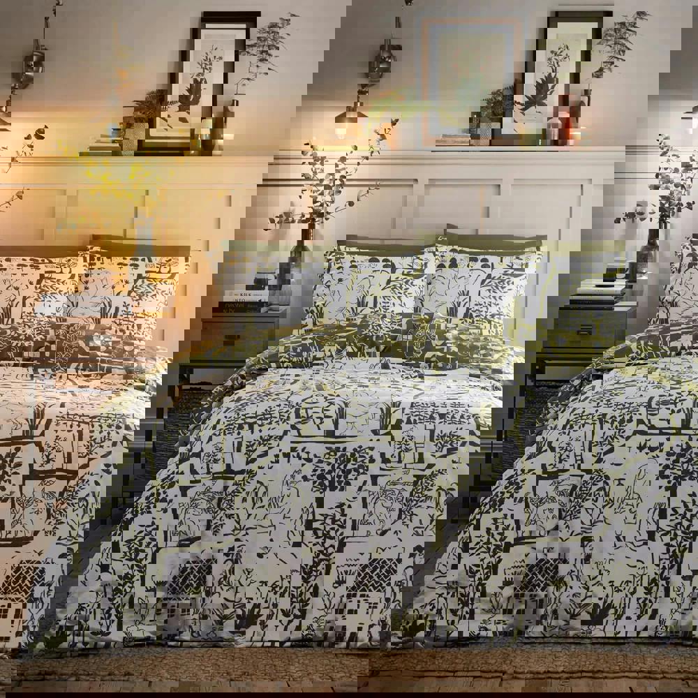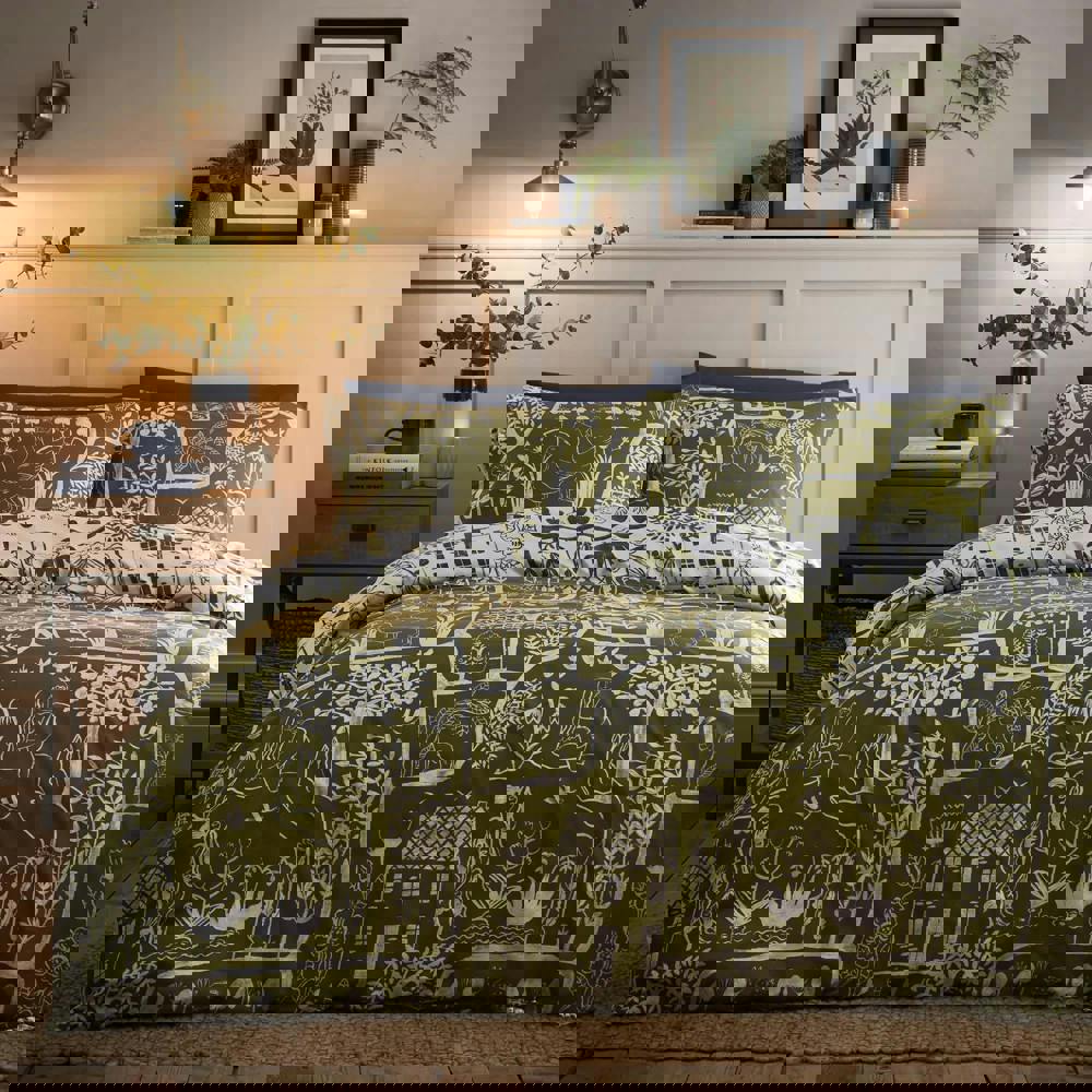 The Furn Frida Reversible Abstract Duvet Cover Set in Moss is designed to refresh your bedding with a printed, reversible look. Featuring an abstract floral design with hand, house and plant motifs, it offers two looks in one, making it easy to change the feel of your bedroom without switching your whole set.