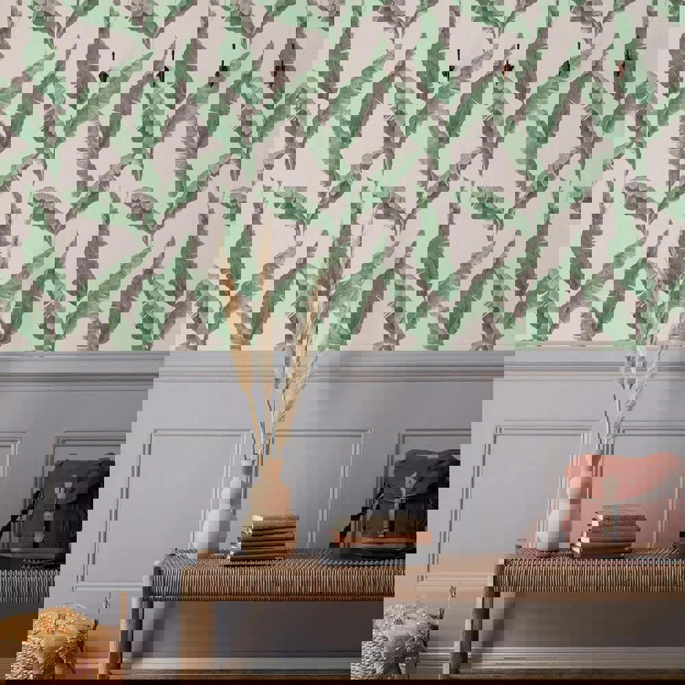 Bring a bold botanical look to your interior with the Furn Plantain Wallpaper in teal and blush. Featuring a printed banana leaf design with a textured effect, it adds visual interest to feature walls or full-room schemes, helping to create a considered, decorative finish.