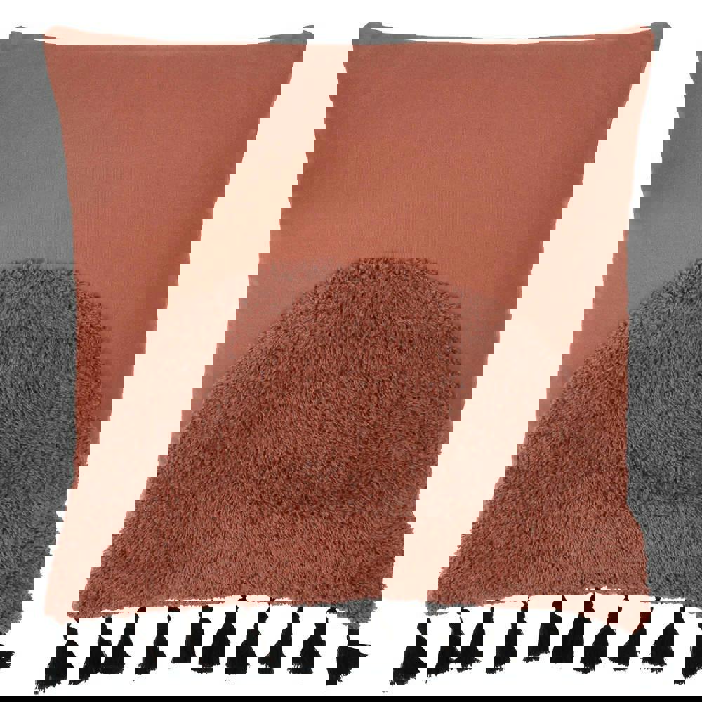 The design combines a plain reverse with a distinctive rectangular shape and semi-circle detailing, finished with tufting and tassel trim for added texture. A concealed zip fastening keeps the look neat and makes the cover simple to remove when you want to switch up your décor. Please note: insert not included.