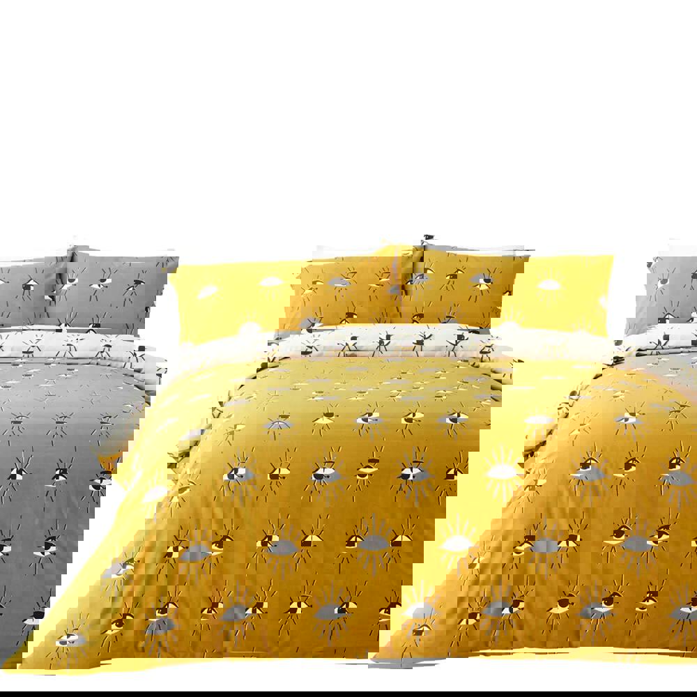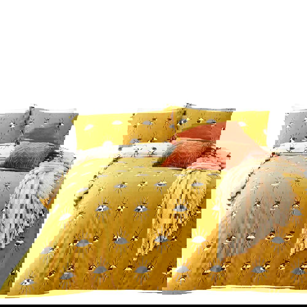 Bring a bold, contemporary look to your bedroom with the Furn Theia Eye Duvet Cover Set in ochre yellow. Featuring an abstract eye design, it’s an easy way to refresh your space while keeping your bedding feeling comfortable for everyday use.