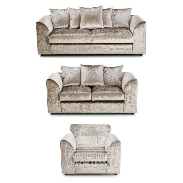Add glamour and comfort to your living room with the UK-Made Crystal Crushed Velvet Sofa Suite. This elegant set includes a 3 seater sofa, 2 seater and armchair, all upholstered in shimmering crushed velvet with scatter back cushions for a stylish and cosy finish.