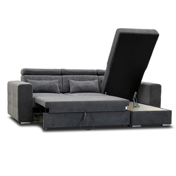 The Miami Corner Sofa Bed. The Miami Sofa Bed offers a double bed functionality along with a lift-up storage compartment. It's great for when you have an unexpected sleepover! Featuring chrome legs to offer that extra bit of design to your décor, this sofa bed has a smooth and modern design. The soft grey material looks great with any décor of choice.