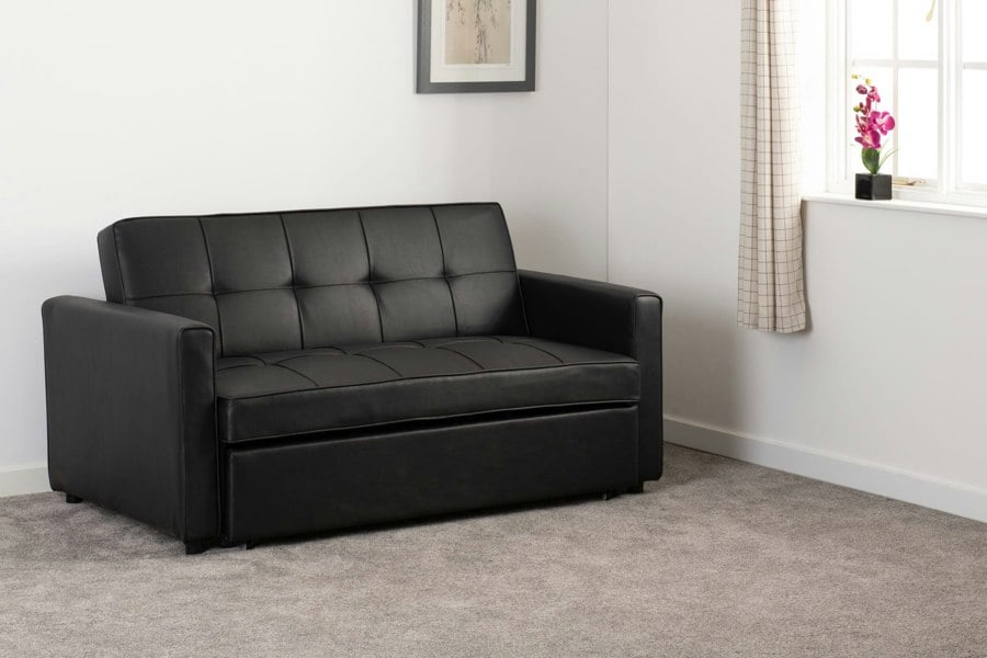 Tori 2 Seater Faux Leather Sofa Bed offers a bed functionality that sleeps two people, ready for when you have an unexpected sleepover! The full foam cushions with a tufted design creates a stylish yet comfortable sofa. Upholstered in a durable faux leather. Available in Black.