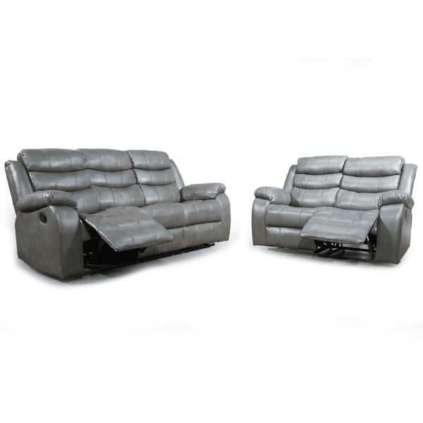 Upholstered in premium leatheraire. This reclining sofa suite includes 3 seater and 2 seater. The design is made for comfort. It includes luxuriously padded arms and a manual 3-positioning recliner function. Middle seat on the 3 seater does not recline.