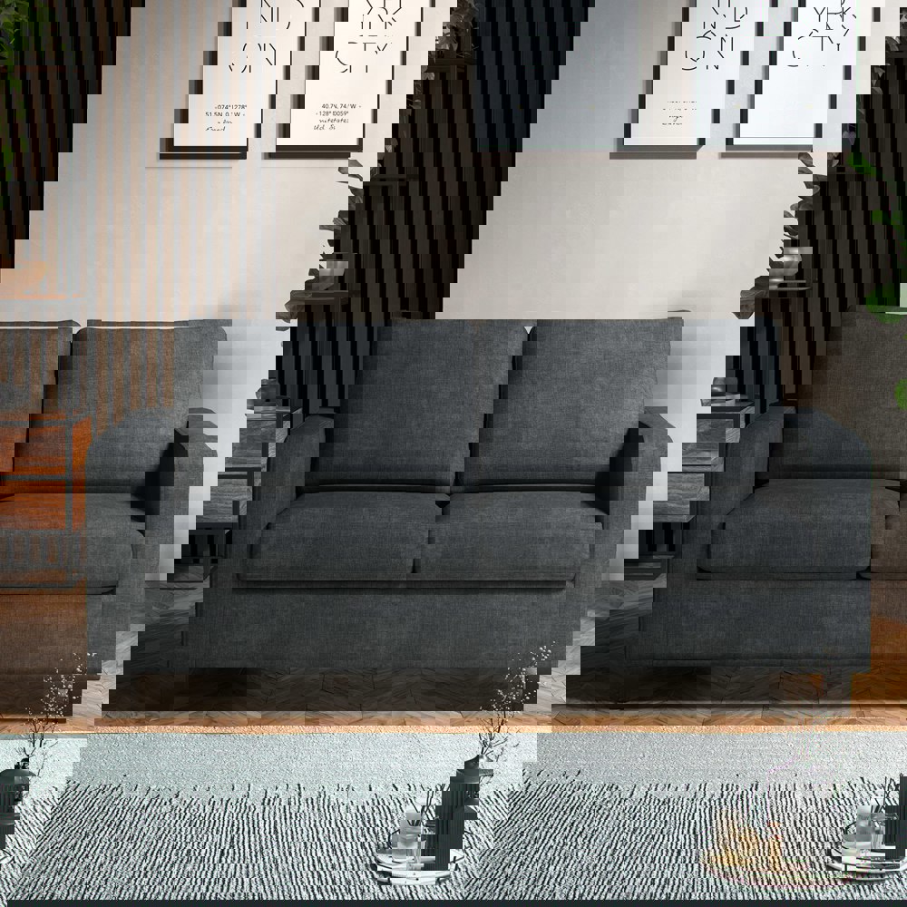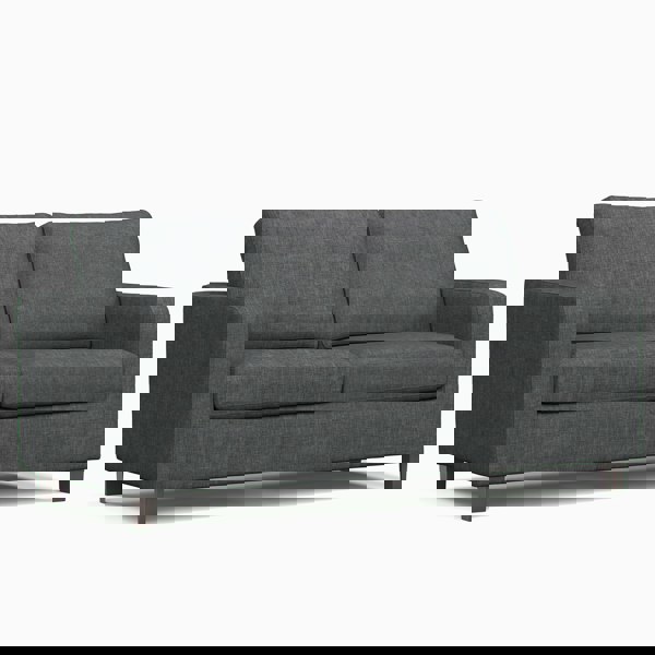 Elegant square arms paired with sleek black wooden feet for a modern, timeless appeal. Upholstered in rich grey turin fabric, adding a touch of sophistication to any room.