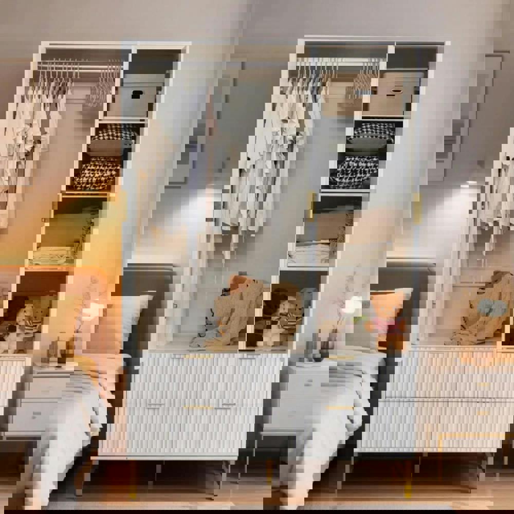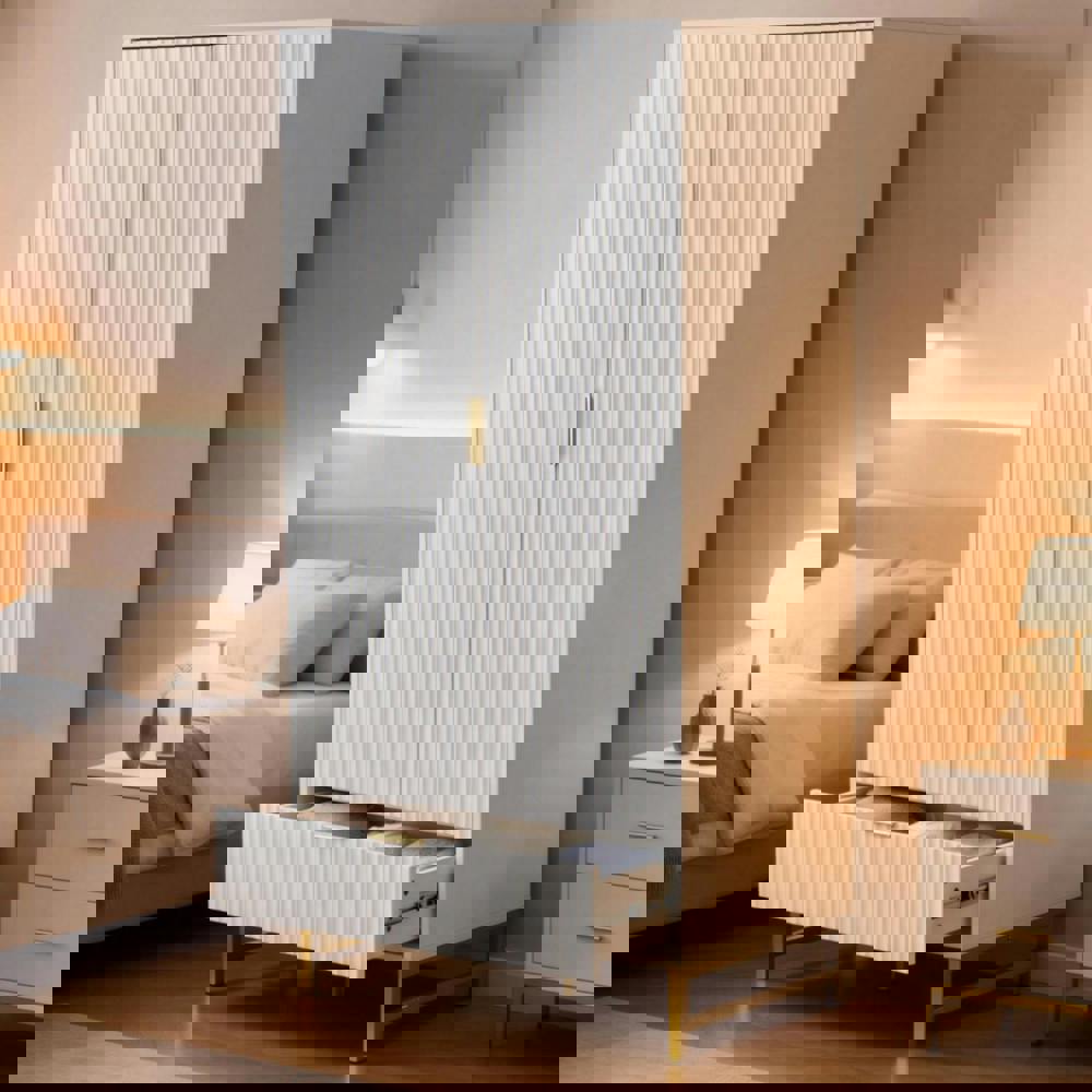 This wardrobe cabinet combines a chic fluted look with softly curved detailing and wide gold-finish metal handles, creating a refined statement for contemporary interiors. Designed as a practical clothes storage unit, it offers a neat way to organise everyday essentials while keeping your space feeling considered and uncluttered.