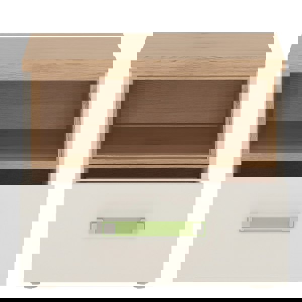 1 drawer bedside cabinet in light oak and white high gloss with lemon handles. This neutral and functional kids collection is perfect for all age groups, finished in light oak and stunning white high gloss. Nice compact small 1 drawer bedside with open shelf for magazines.