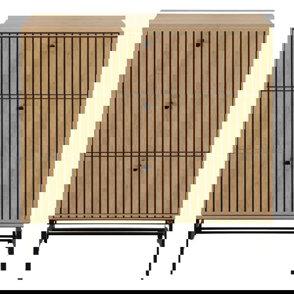 The Albany rectangular chest of drawers blends modern design with natural charm. Featuring a top, frame, and three drawers in oak rough melamine, it showcases a textured lamella fronts for added character. The geometric base, crafted from matte black rough powder-coated steel, adds a sleek, industrial touch. Measuring 80. 6x40x80. 4 cm, this chest offers stylish storage for any contemporary living space.