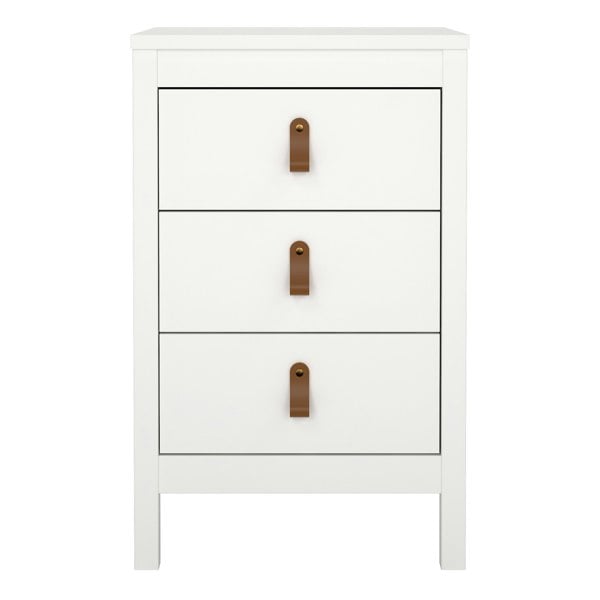 Enhance your bedroom with the elegant Barcelona Bedside Table. Made with a white finish, it features three drawers with leather strap handles and smooth gliding runners. This stylish and functional piece is perfect for any modern bedroom.