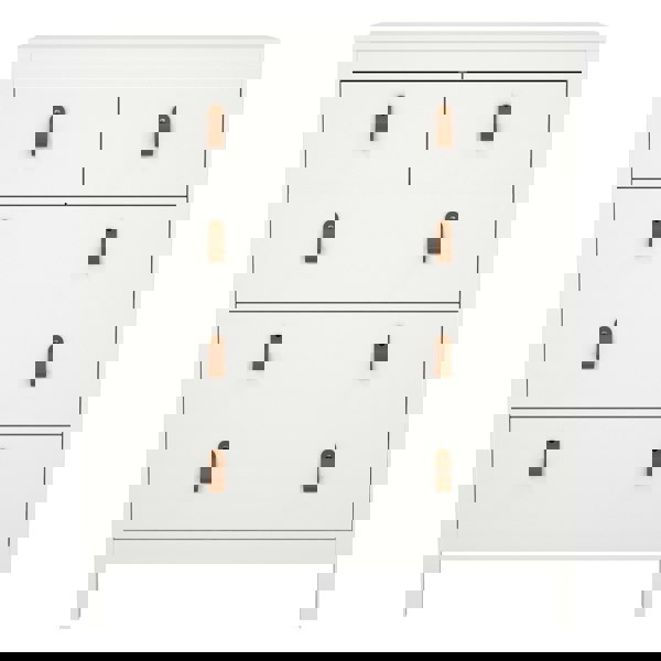 A modern chest of drawers in a striking design complete with brown leather tab handles, also available in contrasting matt black