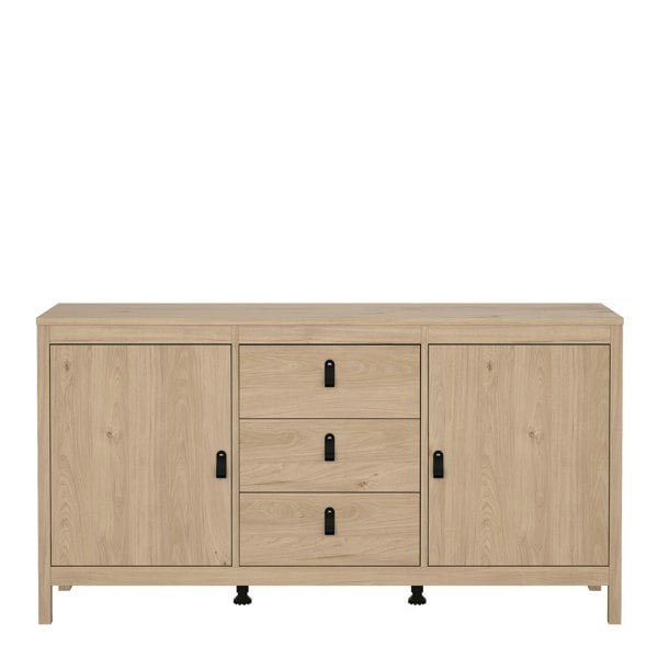 Featuring a Jackson Hickory Oak effect finish, the Barcelona sideboard offers ample storage with two doors and three spacious drawers. The drawers are equipped with metal glide runners for smooth operation, and sleather strap handles add a touch of modern sophistication. Combining style and functionality, the Barcelona Sideboard is a perfect addition to any contemporary home.