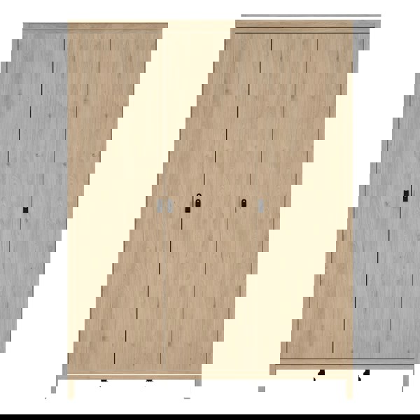 Enhance your bedroom with the stylish Barcelona Wardrobe. Featuring a Jackson Hickory Oak effect finish, this wardrobe offers generous storage space behind its three doors. Inside, you'll find a spacious hanging area, shelves, and drawers, perfect for organizing your clothing and accessories. With leather strap handles and a contemporary design, the Barcelona Wardrobe combines elegance and practicality, making it an ideal addition to any modern bedroom.
