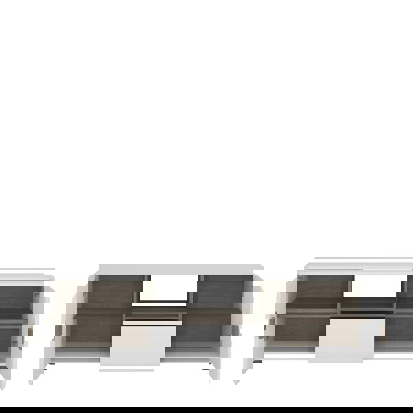 Wide TV unit in white with an Truffle Oak trim. Unconventional design - a proposal for the followers of the latest trends. The clever mix of scratch resistant white melamine with beautiful high gloss fronts and oak melamine trim makes this top quality collection of furniture the ideal destination for the most modern of homes, the massive range that includes many cabinets and wall units fulfils every storage and display option.