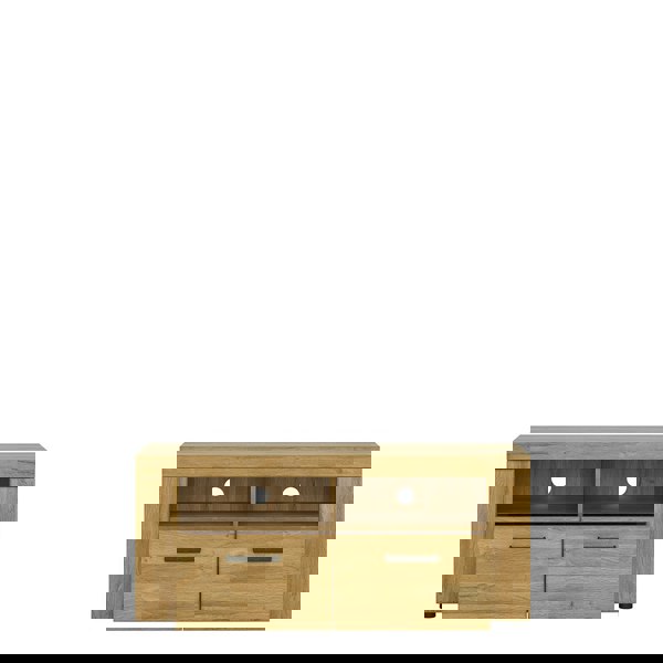 The TV cabinet is an inseparable part of the living room. It has two spacious drawers and open shelves on which you can place your electronics. For the lovers of natural wood, this range offers you the oppotunity to enjoy the charm of wooden furniture at an affordable price. Made from high quality MDF in the colour of grandson oak, which looks just like natural timber. An additional feature is the beautiful antique metal handles which gives a timeless elegance to the collection.