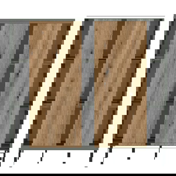 Elevate your living space with the stylish Darwin Green and Oak Sideboard. Featuring sliding grooved oak doors and a sleek grey-green finish, it's both practical and elegant. With spacious shelves and a minimalist handleless design on high metal legs, it offers ample storage and a chic, modern look.