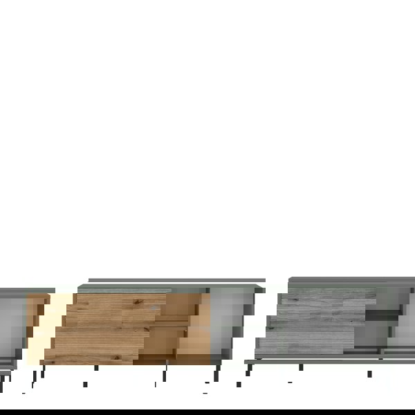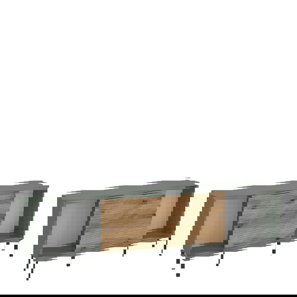 Elevate your living space with the Darwin Green and Oak TV Cabinet. Combining modern design with practicality, it features a grooved oak sliding door and spacious shelves for storage. Crafted from durable laminated chipboard and MDF, the sleek grey-green body contrasts beautifully with the oak finish. Set on high metal legs, it adds a stylish touch to any room.
