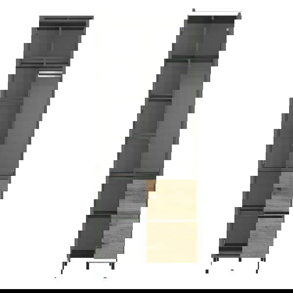 Update your room with the Darwin Green and Oak Wardrobe. Featuring a sleek grey-green finish and Coast Evoke Oak accents, it offers modern style and practicality. This two-door wardrobe includes two spacious drawers and a metal rail, with a push-to-open mechanism and smooth ball-bearing guides for easy use. Elevated on high metal legs, it complements eclectic, vintage, loft, and glamour interiors.