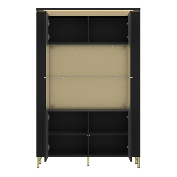 Elevate your space with the Genoa Black and Gold Display Cabinet. Featuring a matte black finish with gold accents, this stylish piece combines elegance and function. Crafted from MDF and laminated chipboard, it includes two partially glazed doors with tempered glass, gold metal handles, and high gold-toned legs. Structural LED lighting adds a modern touch.