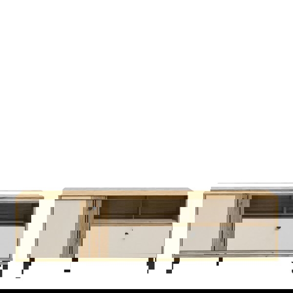 Upgrade your living room with the Grafton TV Unit in Cream and Oak. Industrial design, Mauvella oak/Sandy finish, soft-closing system, and drawer on ball bearing slides.