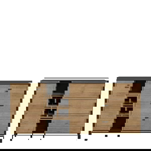 High Rock, a captivating and contemporary collection which has a perfect blend of the Riviera Oak decor with deep black accents, this collection immediately captivates attention with its originality. The sleek black metal handles add a touch of elegance, while the tables boast robust metal legs in a frame-like design, contributing to a distinct loft character within the space. Beyond its striking aesthetics, High Rock prioritises functionality with its ingenious storage solutions. Cabinets, chests of drawers, and display cabinets offer ample space to organise belongings, while the thoughtfully equipped tables come with practical drawers. This versatile collection effortlessly fits into any room, from the living room and dining area to the hall, youth room, or bedroom, adding a touch of sophistication and practicality to every corner of the home.