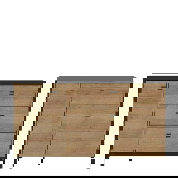 High Rock, a captivating and contemporary collection which has a perfect blend of the Riviera Oak decor with deep black accents, this collection immediately captivates attention with its originality. The sleek black metal handles add a touch of elegance, while the tables boast robust metal legs in a frame-like design, contributing to a distinct loft character within the space. Beyond its striking aesthetics, High Rock prioritises functionality with its ingenious storage solutions. Cabinets, chests of drawers, and display cabinets offer ample space to organise belongings, while the thoughtfully equipped tables come with practical drawers. This versatile collection effortlessly fits into any room, from the living room and dining area to the hall, youth room, or bedroom, adding a touch of sophistication and practicality to every corner of the home.