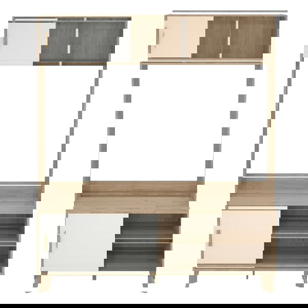 The Ikast TV Wall Unit features two sliding doors in Jackson Hickory and White. This wall unit combines modern design with vibrant color accents, offering both style and functionality. Perfect for your living room, it provides ample storage space for your media essentials while adding a touch of sophistication to your decor.