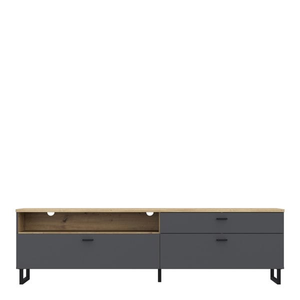 Enhance your living room with the Klara TV Unit in Grey and Oak. Modern design, Artisan Oak/Uni Wolfram Grey finish, and fits TVs up to 86 inches.