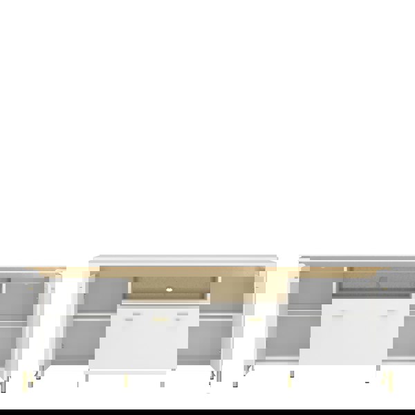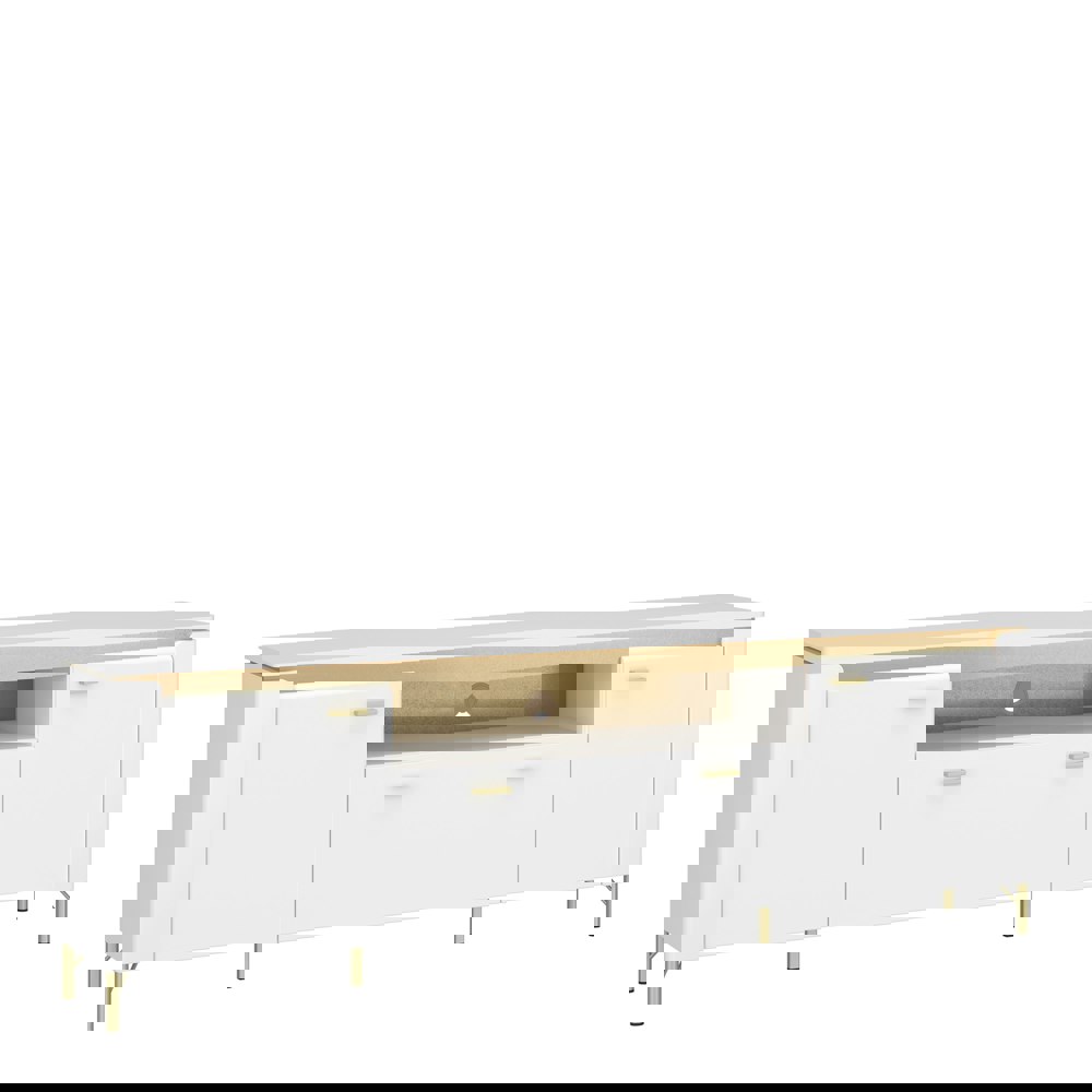 Elevate your living area with the Lazio TV Cabinet in Alpine White and Gloss White. This modern piece features two doors, one drawer, and LED lighting for a touch of luxury. Crafted from MDF and laminated chipboard, it blends sleek white with gold accents and high metal legs. The cabinet includes soft-close doors, a spacious drawer with ball-bearing guides, and an open shelf.