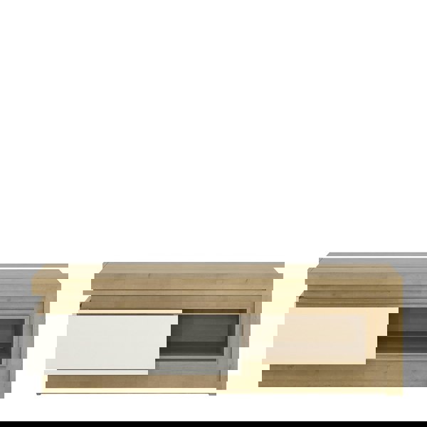 1 drawer TV cabinet with open shelf (including LED lighting) in Riviera Oak/White High Gloss. Nice compact 130cm wide low TV cabinet, has opening for satellite accessories, and handy storage drawers fitted with easy gliding runners. A high quality collection in a ultra modern design - with each item complementing each other.