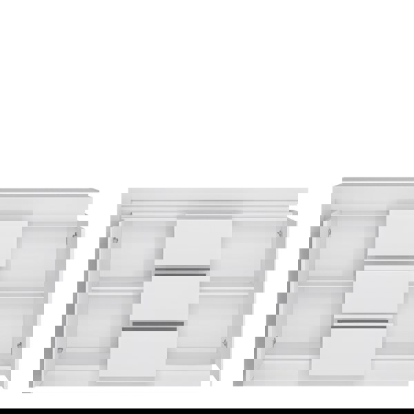 Lots of hidden storage space in this modern sideboard with 3 drawers and 2 cupboards with adjustable shelving. Includes a concealed lighting arrangement. The designers of this range have combined several rectangular shapes and produced a modern collection in 3 different colourways, Riviera light oak and white high gloss fronts, contrasting greys and white and gloss white.