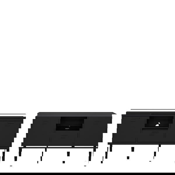 This Media TV unit is traditional Danish design and produced with an easy to clean foil surface. Made and manufactured in Denmark. It features a simple, low-profile, multifunctional design to keep all your media components organized. The simple yet appealing includes three media compartments and one drawer including one shelf behind each door for additional storage.