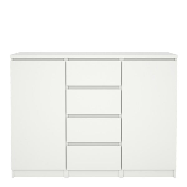 The Naia Sideboard with 2 white doors and 4 white drawers cuts a striking figure in this serene bedroom setting, offering a masterful concealed drawer storage in a pristine white finish. This aesthetic Naia sideboard in matt white has 2 concealed shelves behind each door which are adjustable and 4 spacious drawers designed with steel bearing mechanism.