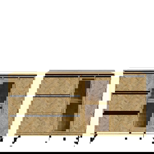 Behold the magnificence of the Nikomedes, a true masterpiece that seamlessly captures the essence of a beautiful contemporary design. This exceptional piece showcases decorative panels that pay homage to the classic wood block floor pattern, infusing your space with a sense of rustic nostalgia and warmth. Embrace the sophistication of this mid-century modern style and complete your living or dining space.