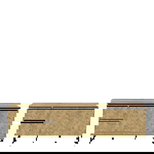 Behold the magnificence of the Nikomedes, a true masterpiece that seamlessly captures the essence of a beautiful contemporary design. This exceptional piece showcases decorative panels that pay homage to the classic wood block floor pattern, infusing your space with a sense of rustic nostalgia and warmth. Embrace the sophistication of this mid-century modern style and complete your living or dining space.