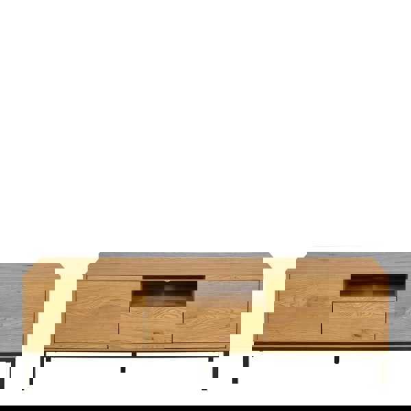 Maximise both functionality and style in your living space with the Seaford TV Unit flawless fusion of practicality and contemporary design. Crafted with a sleek, minimalist aesthetic, it showcases a warm oak finish complemented by striking black steel accents, effortlessly enhancing any room with understated elegance. Whether you’re in a cosy apartment or a spacious family home, this 140cm oak TV unit will fit right in and steal the show.