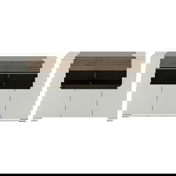 140 cm wide TV Cabinet. Nice compact 140cm wide low TV cabinet, has openings for satellite accessories, and plenty of storage behind soft close doors. Warm and yet cool living and dining collection in white High Gloss with San Remo Oak inset.