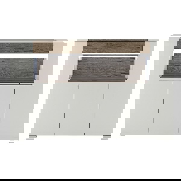 3 Door Sideboard with open shelving (inc, Plexi Lighting). This 3 door sideboard has many features including soft close doors. internal LED lighting and adjustable shelves. Warm and yet cool living and dining collection in white High Gloss with San Remo Oak inset.