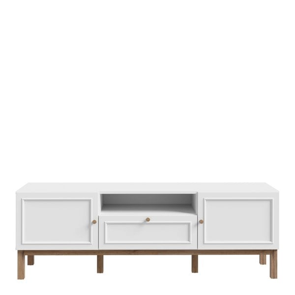 Elevate your living room with the Wensley 2 Door 1 Drawer TV Unit in Light Grey and Oak. Modern design, full-extension drawer slides, optional LED lighting, and chic wooden knob handles.