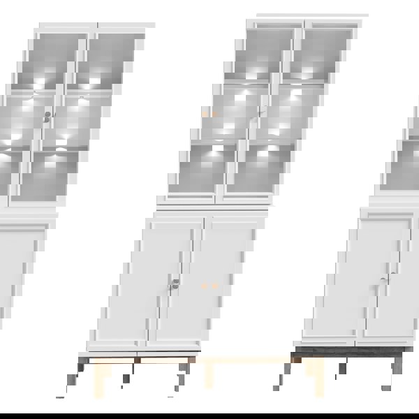 Showcase your treasures with the Wensley Display Cabinet in Light Grey and Oak. Modern design, LED lighting, soft-closing system, and elegant wooden knob handles.