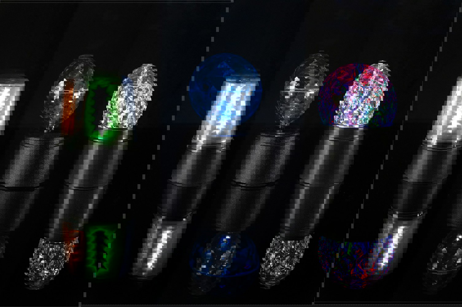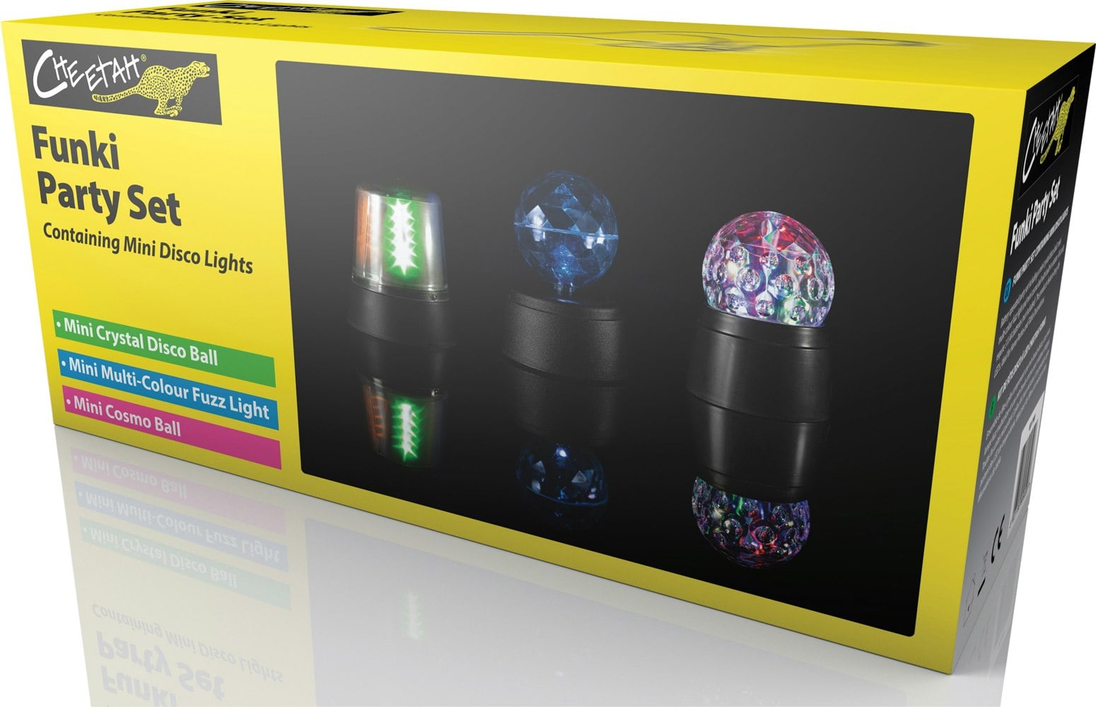 Battery operated disco light set including a mini crystal disco ball, mini multi-colour fuzz light and mini cosmo ball all with built-in rotator.