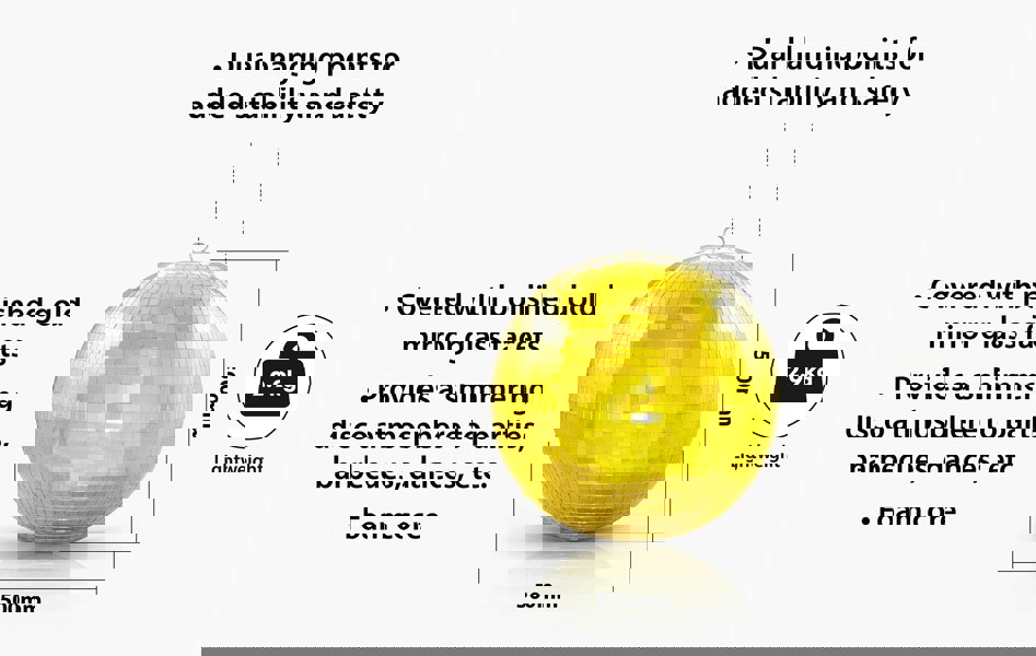 A lightweight gold mirror ball with dual hanging points which can provide a shimmering disco atmosphere to parties, barbecues, dances, (etc) by projecting a sparkle effect onto surfaces within range when a spotlight is directed at it