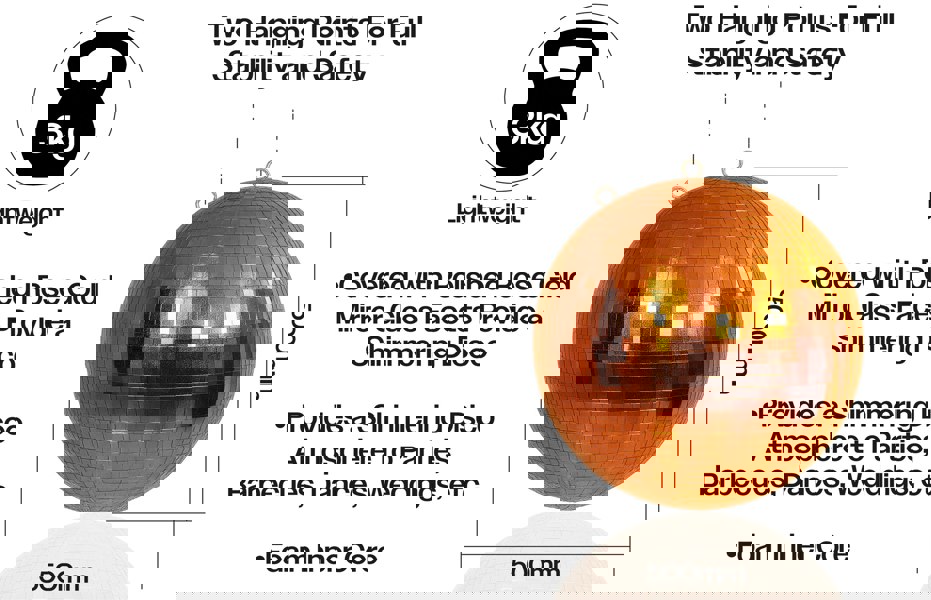A lightweight rose gold mirror ball which creates a sparkling, shimmering light extravaganza adding an authentic disco atmosphere to parties, barbecues, dances, (etc) when a spot light is shined at the ball.