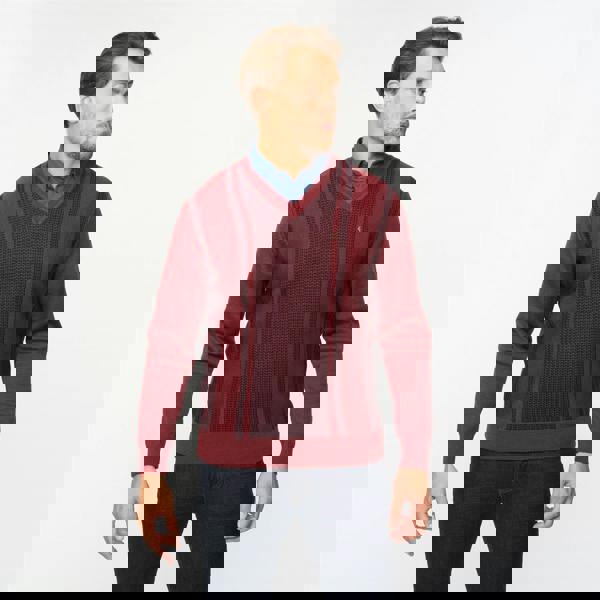 This Fancy Vee Neck Sweater comes in the classic mulberry colourway with a clean, traditional look. The V-neckline creates a neat finish, while ribbed trims add structure at the cuffs and hem. A chest emblem adds a subtle branded detail to the front.