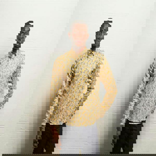 The Gabicci Vintage Brodie woven shirt adds a heritage-inspired look with an all-over seasonal print in gold. It has a clean, structured profile with a point collar, long sleeves and a button-through front, keeping the silhouette classic and easy to style.