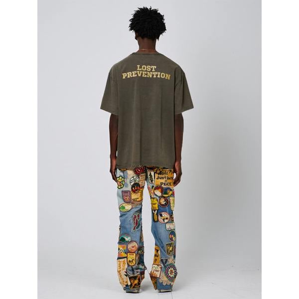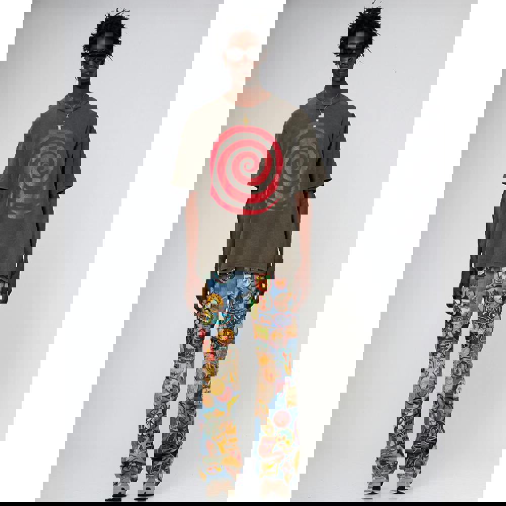 Gallery Dept. 's Lost T-Shirt in Faded Black is crafted from 100% cotton jersey, delivering a soft, breathable feel with a naturally worn-in texture. Featuring a hypnotic spiral print on the front and glittered "lost prevention" lettering on the back, this small-fit tee blends comfort with distinctive, vintage-inspired streetwear style. Designed by contemporary artist Josué Thomas, it offers a unique artistic edge for those seeking an authentic, standout piece