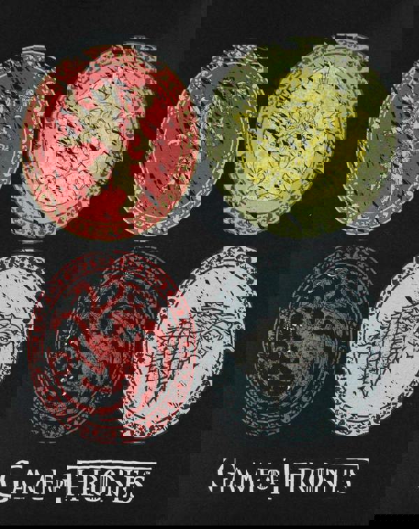 The large print showcases four iconic Game of Thrones house crests: the Lannister's roaring lion, Tyrell's golden rose, Targaryen's three-headed dragon, and the Stark's Direwolf head.