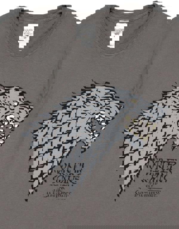 The large print across t-shirt showcases the House Stark Sigil in great detail capturing the Direwolf's snarling mouth along with the motto 'Winter is Coming'